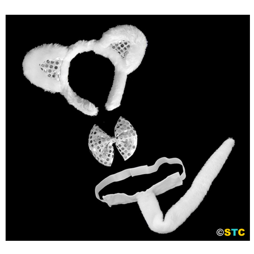 | Description: | Deluxe Cat Accessory Set includes white plush cat ears with silver sequin lining, white plush bendable & poseable tail with velcro straps attached for easy wear and can stretch up to 18 inches long, and silver sequin bow tie with white elastic band attached. |
